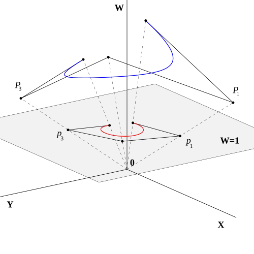 - rzut perspektywiczny krzywej wymiernej jest zawsze krzywą wymierną, podczas gdy rzut perspektywiczny krzywej wielomianowej nie musi być krzywą wielomianową (co ma znaczenie w grafice komputerowej);
