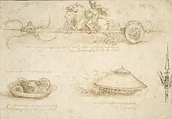 Projekt wozu zbrojnego (w źródłach określanego również jako czołg) powstał około 1484[16] lub ok. 1487–1488 roku[17]. Wóz stanowił zestaw artyleryjski lub transporter opancerzony, mający wywoływać efekt zaskoczenia i strachu u wroga[18]. Pojazd mógł pomieścić osiem osób[19][20].