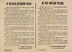 - ↑ Jak poważnie rząd polski traktował sprawę niepodległości Ukrainy świadczy jeden z rozkazów Naczelnego Dowództwa Wojska Polskiego z 8 maja 1920 roku, w którym polecano dowódcom jednostek: zawiadomić całą ludność polską, że musi ona zrozumieć jasno, że jeśli chce się uchronić przed ponowną inwazją bolszewicką, jaka po wyjściu stąd wojska polskiego może nastąpić – winna szczerze i dla własnego interesu oddać swe siły dla stworzenia państwowości i wojska ukraińskiego, którego stworzenie może jedynie uchronić ten kraj przed powrotem hord komunistycznych. Janusz Szczepański: Społeczeństwo Polski w walce z najazdem bolszewickim 1920 roku, Warszawa-Pułtusk 2000, s. 111, 112.