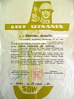 - zawiadomienie zakładu pracy, organizacji politycznej lub społecznej albo prezydium gromadzkiej (miejskiej, dzielnicowej) rady narodowej lub rady narodowej osiedla o wzorowym wykonywaniu obowiązku żołnierskiego