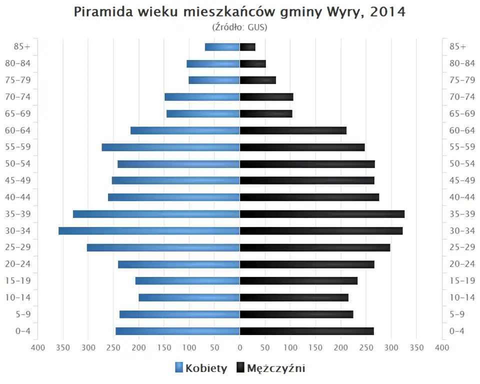 - Piramida wieku mieszkańców gminy Wyry w 2014 roku[18].