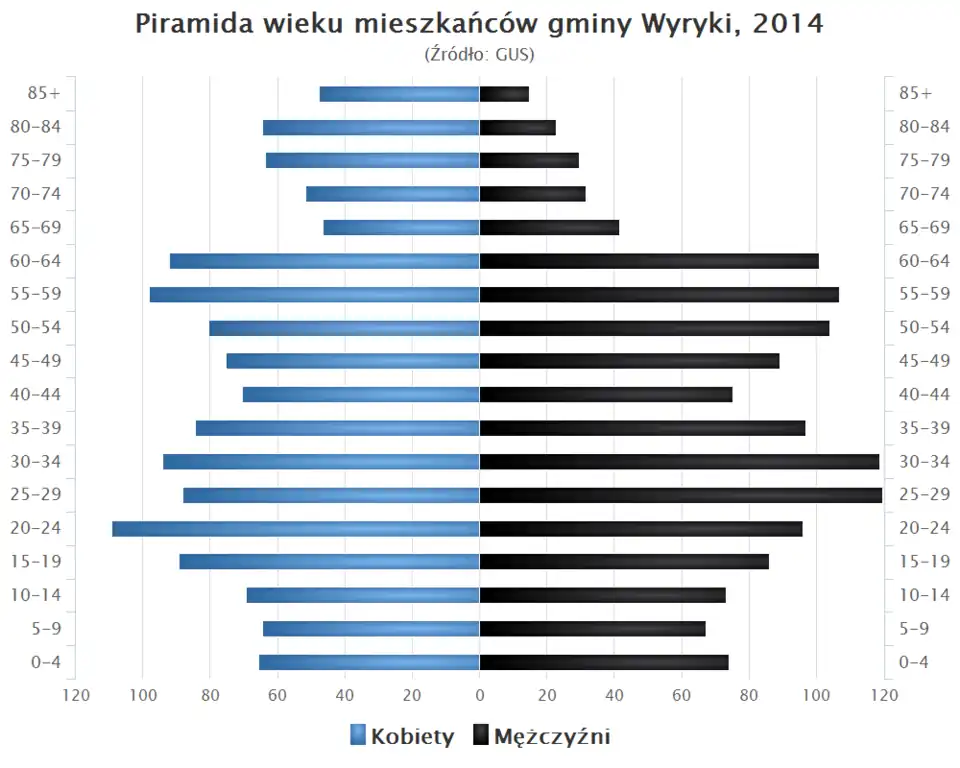 - Piramida wieku mieszkańców gminy Wyryki w 2014 roku[1].