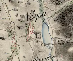 We wsi znajdował się zamek (obecnie na jego miejscu jest cmentarz), z daleka widać wyraźnie umocnione fortyfikacje starego drewnianego zamku (mury, wieże).