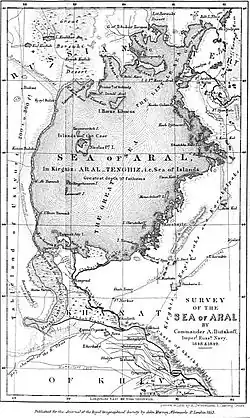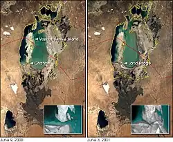 - ↑ Proces ten przyspieszył znacznie po roku 1960, kiedy dały o sobie znać skutki nieprzemyślanej gospodarki ZSRR, zużywającej zasoby wodne rzek zasilających jezioro do nawadniania upraw bawełny i kiedy doszło do regionalnej katastrofy ekologicznej