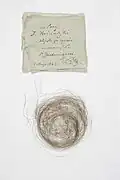 Włosy Tadeusza Kościuszki | Pukiel włosów Kościuszki, obcięty tuż po zgonie i umieszczony w specjalnej sakiewce. Świadectwo kultu, jakim otaczano Kościuszkę w okresie zaborów. | ||
