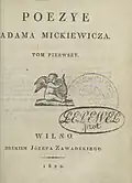 Ballady i romanse | Adam Mickiewicz | 1822 | Egzemplarz pierwszego wydania Poezji Mickiewicza z Balladami i romansami należący do Prota Lelewela. |