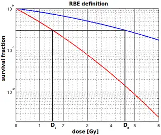 Zgodnie z zaleceniami ICRU względną skuteczność biologiczną definiujemy jako iloraz dawki referencyjnej i dawki promieniowania testowego dającego ten sam efekt biologiczny: