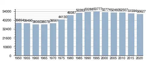 Zmiany w populacji terenu miasta w latach 1950–2020: