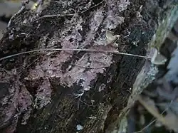 Rozpostarty, do podłoża dość słabo przyrośnięty. Zlewające się z sobą sąsiednie owocniki tworzą dość duży resupinat. Powierzchnia hymenialna kolczasta, słabo kłaczkowata lub podzielona, czasami błyszczącą, niekiedy żyłkowana, żółtawoszara w różowym odcieniu, niekiedy z purpurowym lub fioletowym odcieniem, albo purpurowobrunatna. Płonny brzeg strzępiasty z ryzomorfami, początkowo białawy, w końcu tej samej barwy co powierzchnia hymenialna. Kontekst skórzasty o grubości do 0,5 mm. Kolce o długości do 0,5 mm, dość odległe od siebie lub zebrane w gęste wiązki, rzadziej pojedyncze, zwykle różnie pozrastane, brodawkowate lub wydłużone, tej samej barwy co powierzchnia. Ich ostrza są wyraźnie włochate lub spiczaste z wiązkami białych szczecinek[4].
