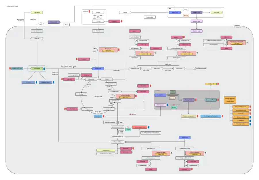 Niedobór ACSF3 w CMAMMA prowadzi do akumulacji kwasu malonowego i mitochondrialnego niedoboru malonylo-CoA[12]. Podczas gdy kwas malonowy konkurencyjnie hamuje kompleks II i ma działanie cytotoksyczne, niedobór substratu malonylo-CoA z kolei prowadzi do zmniejszonej malonylacji białek mitochondrialnych, co wpływa na aktywność enzymów metabolicznych i zmienia metabolizm komórkowy[12]. Zapotrzebowanie na malonylo-CoA może być jednak nadal częściowo zaspokajane przez enzym mtACC1, mitochondrialną izoformę karboksylazy acetylo-CoA 1 (ACC1), co wyjaśnia szeroki fenotyp kliniczny CMAMMA[13]. Niedobory produktów pośrednich mogą być kontynuowane do głównego produktu mtFASII, oktanoilo-ACP, który jest wymagany jako substrat wyjściowy do biosyntezy kwasu liponowego, do montażu kompleksów fosforylacji oksydacyjnej i jako endogenny substrat do β-oksydacji[3].