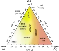 Barwy stopów złota różnią się znacznie w zależności od dodanych domieszek. Różowe złoto powstaje po dodaniu różnych ilości miedzi i srebra, co widać na diagramie trójkątnym. Domieszki palladu i niklu tworzą tzw. „białe złoto”, które często jest wykorzystywane w jubilerstwie. Mniej powszechne są domieszki manganu, glinu, żelaza, irydu i innych pierwiastków[31], które nadają złotu bardziej niezwykłe kolory, jak na przykład niebieski[32][25].