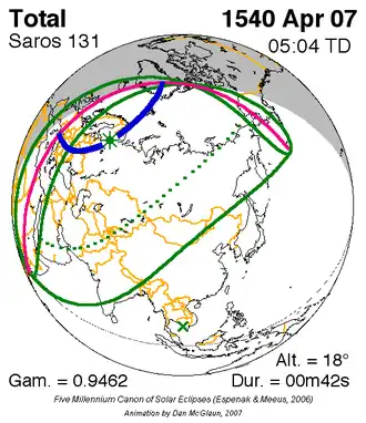 Zaćmienie Słońca z 7 kwietnia 1540 - całkowite zaćmienie Słońca widoczne w pasie od adriatyckich wybrzeży Państwa Kościelnego (Pesaro) przez Republikę Wenecką (m.in. Zadar), Imperium Osmańskie (w tym Wschodnie Królestwo Węgier), Rzeczpospolitą (województwa ruskie i podolskie oraz Wielkie Księstwo Litewskie) i Wielkie Księstwo Moskiewskie aż po Arktykę. Swoje maksimum zaćmienie osiągnęło w okolicach jeziora Wygoziero, gdzie faza centralna trwała 42 sekundy[1].