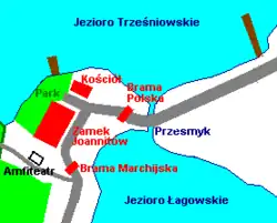 Brama Polska (Poznańska) została wybudowana w XVI w., dla obrony zamku. Cała jest zbudowana z cegieł. Pod bramą znajduje się wąski tunel samochodowy, oraz sygnalizacja świetlna. Przejście przez bramę dla ludzi znajduje się obok. W bramie znajduje się pokój w którym można wypocząć. Nad przejazdem dla samochodów, znajdują się dwa okna. Tuż przed bramą od strony wschodniej znajduje się drewniany most nad Kanałem Łagowskim (przesmyk jeziora Trześniowskiego i Łagowskiego), oraz restauracja "Pod Lipami". Na bramie znajduje się tabliczka o treści: „Brama Polska zbudowana w XV w. Odrestaurowano ze środków zielonogórskiego okręgu PZW w 1998”. Dawniej pomalowana była na biało, podobnie jak brama Marchijska, lecz przy odrestaurowaniu odkryto ceglaną cześć bramy.