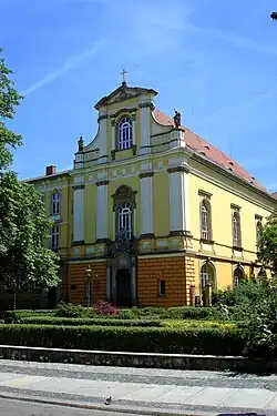 • kościół klasztorny benedyktynek pw. św. Maurycego, ob. szkoła, pl. Klasztorny 7, z pocz. XVIII w., 1886 r., 1909 r.