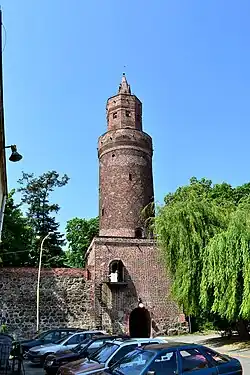 - Baszta Białogłówka zlokalizowana w najstarszej części Starego Miasta, na miejscu dawnego grodziska, zbudowana na początku XV wieku. Swoją nazwę wzięła od zwieńczającego jej hełm sześciobocznego stożka, otynkowanego na biały kolor. Oparta na podstawie kwadratowej, przechodzącej w kształt cylindra do wysokości ok. 30 m.