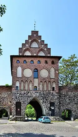 - Brama Młyńska (także Portowa, Wodna, Rzeczna, Herbowa) Została zbudowana na początku XV wieku. Pierwotnie dwie wolnostojące wieże były połączone drewnianym mostem, które później zastąpiono murowaną budowlą z przejazdem. Nazwa bramy nawiązuje do młyna, który do połowy XVIII wieku wznosił się na d rzeką nieopodal bramy. Brama Młyńska od wieków stanowiła symbol miasta, a jej sylwetka była przedstawiana na pieczęciach oraz była elementem dawnego herbu miasta. Brama Młyńska stanowi unikat w skali europejskiej.