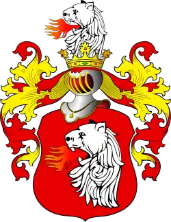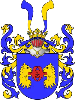 - ↑ Lub: W polu błękitnym lwia głowa srebrna z pięcioma językami.