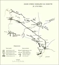 25 kwietnia 1920 dywizja o godz. 4.00 rozpoczęła marsz[4]. W ciągu dwu dni miała pokonać 170 km, by w nocy 26 na 27 kwietnia rozpocząć natarcie. 25 kwietnia maszerujący na czele Dywizji 14 Pułk Ułanów Jazłowieckich zbliżył się do mostu na Słuczy, gdzie wizytował Dywizję Naczelnik Państwa Józef Piłsudski. 9 pułk ułanów 25 kwietnia musiał szarżować na kawalerię bolszewicką, która odpowiedziała kontratakiem, odpartym przez karabiny maszynowe 9 pułku ułanów. 26 kwietnia pierwszy szwadron ułanów krechowieckich z pionierami wysadził most kolejowy na trasie z Żytomierza do Berdyczowa. Tego dnia straż tylna dywizji weszła w kontakt ogniowy z nadjeżdżającym z Berdyczowa pociągiem pancernym. To wskazywało, że bolszewicy nie dadzą się w Koziatynie zaskoczyć. Pionierzy brygady wysadzili tory prowadzące z Kijowa do Koziatyna. 27 kwietnia rozpoczęło się generalne natarcie na dworce[5]. Nieprzyjaciel był dobrze przygotowany i bronił się zawzięcie. Na dworcach było wiele eszelonów z wojskiem, wśród nich szkoła oficerska. Granaty z dział towarzyszących pułkom i granaty ręczne rzucane do wagonów oraz szturm o godz. 6 rano załamały nieprzyjaciela i zmusiły go do poddania. Ułani 1 i 14 pułku parli z dzikim krzykiem wzdłuż wagonów w kierunku stacji osobowej. Opór stawiali tylko komisarze; żołnierze sowieccy poddawali się przy pierwszym wezwaniu.