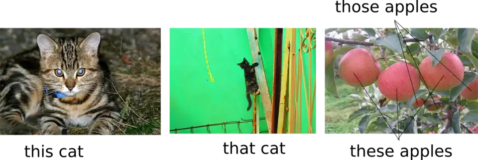 W języku angielskim używa się następujących zaimków wskazujących: this, that, these i those. This i these używa się do osób, zjawisk i przedmiotów, które są blisko mówiącego[21]: