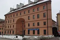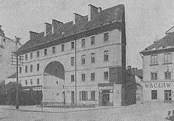 W centralnej części elewacji znajduje się olbrzymia, łukowato zakończona nisza, sięgająca ostatniego piętra, wykończona, podobnie jak okna, prostą opaską. W niszy znajduje się brama wjazdowa, ozdobiona płaskimi kolumnami (odtworzonymi przed 1937). Wnętrze niszy podzielone jest na pięć części. Na wysokości trzeciej kondygnacji, powyżej kolejnej listwy gzymsu łuki stają się płaskimi żebrami, gwiaździście zbiegającymi się. Ostatnie okno prostokątne, zlokalizowane na wysokości piętra, ozdobione jest płaską opaską, identycznie jak pozostałe okna tej kondygnacji. W sąsiednich częściach na dwóch kondygnacjach przebito wąskie okienka szczelinowe. W niszach po prawej i lewej stronie umieszczone są tablice informacyjne: jedna mówi o Dziekance, druga poświęcona jest Józefowi Elsnerowi.