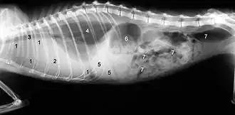 1 cień rozlany spowodowany płynem w dolnej części klatki piersiowej, 2 serce bez widocznych konturów z powodu płynu, 3 tchawica, 4 płuco (tylko niewielka część jest wciąż wentylowana), 5 wątroba, 6 żołądek, 7 jelita