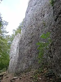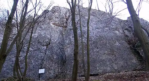 Zbudowany z wapienia Zaklęty Mur znajduje się w lesie. Ma postać połogiej i pionowej ściany o wysokości do 22 m, z kilkoma pionowymi rysami. Jest obiektem wspinaczki skalnej[3].