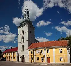 - Budynek „Sokoła” z kwadratową wieżą (ob. kino);