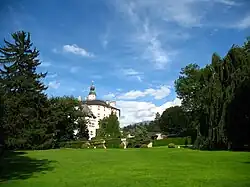Park pałacowy otacza zamek powyżej dzielnicy Amras. Zaraz za głównym wejściem widzimy Großer Weiher Duży staw. Areał otoczony murem został w większości zaaranżowany jako ogród angielski. We wschodniej części parku można znaleźć relikty renesansowego założenia. Warta zobaczenia jest jaskinia Rycerska, Keuchengarten (Ogród więzienny) i sztuczny wodospad, zasilany przez boczną odnogę potoku Sistanser Bach. Przy wschodnim wejściu do parku znajdują się resztki wieży dawnego kościoła Św. Jerzego (St. Georgskirche).