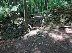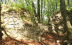 Zachowane resztki pozwalają przypuszczać, że obiekt składał się kiedyś z zamku górnego i dolnego[1], z dwoma podzamczami i otoczony był głęboką fosą. Zamek dolny otaczał kamienny mur oraz wały z palisadą, które oddzielały poszczególne podzamcza.