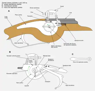 W zamku kołowym zapłon prochu na panewce inicjowany jest przez iskry powstające w wyniku obrotu karbowanego koła ocierającego się o kawałek pirytu który zamocowany jest w szczękach kurka. W celu przygotowania broni do strzału, należało najpierw nakręcić sprężynę koła za pomocą klucza. Naciśnięcie spustu zwalniało sprężynę i powodowało obrót koła krzeszącego iskry zapalające proch podsypany na panewce. Następnie płomień z panewki poprzez otwór zapałowy z boku lufy dostawał się do komory nabojowej powodując zapłon ładunku miotającego i wystrzał.