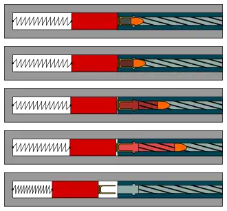 Pierwszym cyklem jest ręczne odciągnięcie zamka do tyłu. Mechanizm spustowy powoduje zatrzymanie zamka w tej pozycji. Po naciśnięciu spustu zamek zostaje zwolniony i sprężyna powoduje gwałtowne przesunięcie zamka do przodu. W trakcie zamykania dolna część bloku zamka wypycha nabój z magazynka i wciska go do komory nabojowej, a pazur wyrzutnika zaczepia o kryzę łuski naboju. W momencie zatrzymania się bloku iglica pod wpływem bezwładności przesuwa się do przodu i uderza w spłonkę naboju. Następuje detonacja materiału inicjującego, deflagracja ładunku prochowego i strzał. Wskutek działania gazów prochowych na dno łuski naboju i poprzez nią na czoło bloku zamka, następuje odrzut bloku zamka do tyłu. W czasie odrzutu sprężyna za zamkiem zostaje ściśnięta. Blok zamka cofając się wyrzuca (wyciąga) pazurem wyrzutnika zużytą łuskę. Zamek zostaje wyhamowany przez sprężynę powrotną, ewentualnie uderza jeszcze w zderzak. Następnie ściśnięta za blokiem zamka sprężyna powoduje ruch zamka do przodu ponownie rozpoczynając cykl kolejnego strzału lub też zamek zostaje zatrzymany przez mechanizm spustowy w tylnym położeniu w gotowości do kolejnego strzału.