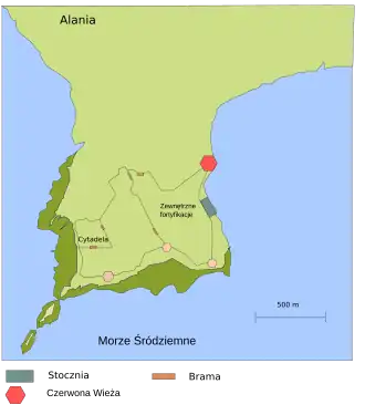 Cytadela, nazywana także Zamkiem Wewnętrznym, umieszczona jest w południowo-zachodniej, najwyższej części cypla na wysokości około 250 m n.p.m. Większość znajdujących się w jej obrębie budynków była budowana wzdłuż murów, tylko w zachodniej części twierdzy (mury wzdłuż urwiska) brak jest zabudowań wzdłuż umocnień. Sądzi się, że większość budynków miała przeznaczenie wojskowe (koszary, magazyny itp.). Jednym z nielicznych zabudowań niegraniczących z murami jest chrześcijański kościół wybudowany za czasów Bizancjum (X wiek). W zamku zachowały się także w dobrym stanie zbiorniki na wodę deszczową zbudowane za czasów Keykubada, które mogły być wykorzystane podczas długotrwałego oblężenia. Ostatnie prace wykopaliskowe na terenie cytadeli ukazały ruiny, które interpretowane są przez archeologów jako pozostałości po pałacu Alaeddina Keykubada. Na terenie zamku, po zewnętrznej stronie murów formujących cytadelę znajdują się także meczet i karawanseraj zbudowane przez Sulejmana Wspaniałego.