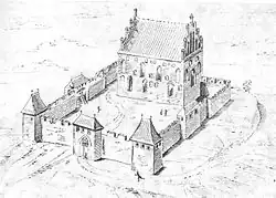 Zamek założono na wzniesieniu w pobliżu rzeki Dajny. Mury obwodowe wzniesiono na planie prostokąta o wymiarach 42,3 x 51,8 m. Wjazd znajdował się przy domu zamkowym od wschodu, a nie jak wcześniej rekonstruował to błędnie Conrad Steinbrecht w kurtynie północnej. Wschodnią i zachodnią kurtynę zaopatrzono w płytkie wykusze. Głównym elementem zamku był dom przylegający do północnej ściany murów, o wymiarach 12 x 25 m. Zbudowano go z cegły, na kamiennym fundamencie. Posiadał dwie kondygnacje mieszkalne, trzecia natomiast służyła celom obronnym. Dzieliły je prawdopodobnie drewniane stropy. Schodkowe szczyty domu zdobione były blendami. Po przejściu w ręce protestantów dobudowano kruchtę i zlikwidowano podziały między piętrami. W latach 1726–1730 powstała okazała dzwonnica, przylegająca do zachodniej ściany domu. W XVI w. na dawnym dziedzińcu utworzono cmentarz, a wschodnia część murów wzbogaciła się o nową bramkę z malowaną inskrypcją.