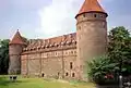 Wieża z bramą wjazdową została wzniesiona od strony północno-wschodniej. Przed bramą wjazdową wykopano fosę, nad którą przerzucono most zwodzony na łańcuchach[3]. Warownia pozwalała zastosować do obrony broń palną, co było ówcześnie novum. W zamku na stałe przebywało od kilku do kilkunastu rycerzy zakonnych wraz z giermkami i knechtami. Pełna załoga zamku składała się z kilkudziesięciu osób.
