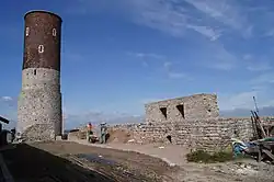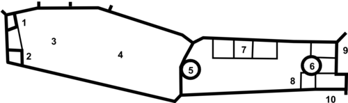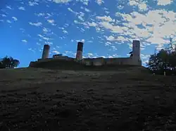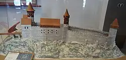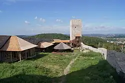 - zamek górny, położony między dwiema basztami z murem o grubości 2 m;