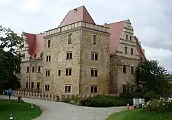 Zamek renesansowy zbudowano w formie czworoboku z wewnętrznym dziedzińcem. Na środku dziedzińca do tej pory rośnie 300-letnia lipa. Na początku XVII wieku do początkowej zabudowy dodano wieżę we wschodnim narożniku. Od tamtej pory kształt budynku pozostał niezmieniony.