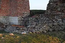 Najlepiej zachowany jest południowo– i północno–zachodni fragment murów zamkowych, które obecnie mają wysokość około 10 metrów[21]. Mur północny zachowany jest tylko w partiach fundamentowych, najprawdopodobniej na skutek działań wód oraz w wyniku rozbiórki[22]. Całość zamku otoczona była fosą[23].