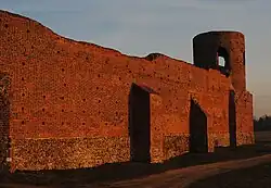 Na podstawie badań archeologicznych w latach 70. XX wieku stwierdzono, że wieża bramna oraz mury obwodowe dobudowano do wieży mieszkalnej[14]. Mury objęły teren na planie prostokąta o wymiarach 50 x 30 metrów[11]. Mury obwodowe wybudowano na fundamencie kamiennym, a ściany z cegieł w wiązaniu gotyckim i wendyjskim[15]. Budowa murów, baszty głównej i budynku bramy datowana jest na przełom XIV i XV wieku lub XV wiek[15]. Mury zdobione są zendrówkami[16].