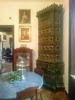 Na parterze, od strony wschodniej, położony jest tak zwany skarbczyk. To pomieszczenie posiada sklepienie krzyżowo-żebrowe, rozwidlone strzałowo, z płaskimi zwornikami w miejscach skrzyżowań żeber[57]. Natomiast same żebra są uformowane w tynku i wyprowadzone wprost ze ściany, nisko, nad posadzką. Posiadają wydatny profil o okoruj jednowklęsłym, z dwoma wałkami, zakończonymi prostokątnie[58]. Pozostałe izby parteru, wraz z piętrem są przykryte przez stropy drewniane, ozdobione renesansową dekoracją malarską z elementami wici roślinnych (odsłonięte w latach 60. XX wieku, podczas prac remontowych)[57].