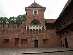 Most nad fosą był także drewniany, prowadzący do budynku bramnego, wystającego z murów zamkowych. Obok wydzielono pomieszczenie dla odźwiernego lub straży.