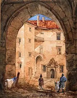 Na poziomie pierwszego i drugiego piętra ryzalit łączy się ze skrzydłem wschodnim poprzez loggię. Na pierwszym piętrze loggia posiada ażurowaną balustradę, pod loggią znajduje się łukowe przesklepienie, będące w połowie zamurowane. Do obu skrzydeł wchodzi się przez kamienne portale. Na klatkę schodową wchodzi się przez nowoczesne drewniane drzwi, podobne prowadzą do przyziemia. Główne wejście, także jest zmodernizowane, i prowadzi na rozległą klatkę schodową, prowadzącą na wyższe kondygnacje.