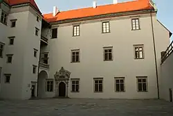 Elewacja wschodnia, frontowa, od strony dziedzińca jest zmodernizowana na poziomie parteru, gdzie zamurowano okna i wstawiono nowe drzwi. W części pierwszego piętra wybito nowe okna. Widoczny jest także wyraźny uskok w grubości ściany na wysokości pierwszego piętra, kryty gontem, jest to ślad dawnego muru średniowiecznego. Na poziomie pierwszego piętra znajdują się okna z krzyżykowymi podziałami.