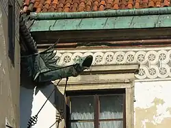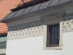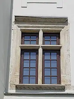 Okna posiadają kamienne obramienia, na parterze i pierwszym piętrze posiadają również krzyżykowe podziały. Na nadprożu jednego z okien znajduje się łacińska inskrypcja:IN THE DOMINE SPERAVI NON CONFUNDETUR IN AETERNUM PSALL, w prawie identyczną inskrypcję zaopatrzona jest chrzcielnica kamienna w kościele farnym z datą 1511.