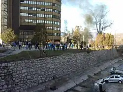 W centrum Sarajewa demonstranci podpalili siedzibę kantonu sarajewskiego, po czym policja użyła gazu łzawiącego i gumowych kul. Protestujący próbowali też wejść do siedziby prezydium Republiki Bośni i Hercegowiny, lecz policja użyła armatek wodnych[45].
