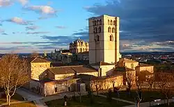 - Katedra El Salvador zbudowana w latach 1151–1174[6]. Świątynia ma układ bazylikowy, trójnawowy. Wieża główna kościoła została zlokalizowana od strony zachodniej, w nawie północnej. Ma ona przekrój kwadratowy i jest podzielona po wysokości na 5 odcinków, z czego tylko trzy ostatnie posiadają okna. Na skrzyżowaniu nawy głównej z transeptem znajduje się dodatkowa wieża o charakterystycznej formie i bogatych zdobieniach (hiszp. cimborrio). Jej dach pokryty jest rzeźbioną, kamienną dachówką. Wiele późniejszych kościołów w dolinie rzeki Duero (min. kolegiata w Toro, katedry w Salamance i Palencii) wzorowało się na tym rozwiązaniu architektonicznym. Spośród elewacji budynku na szczególną uwagę zasługuje strona południowa ze swoimi misternymi rzeźbieniami (jedyna w pełni oryginalnie zachowana), tzw. Portada del Obispo. Wewnątrz katedry znajduje się bogate wyposażenie, min. ołtarz z końca XV w – dzieło Fernando Gallego[7][8][9][10].