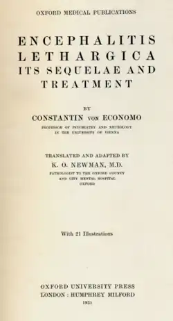 - ↑ Von Economo C. Encephalitis lethargica. Its sequelae and treatment. Translated by Newman KO. London: Oxford University Press; 1931.