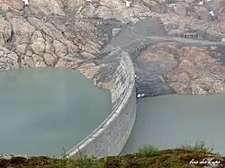 Zapora była konstrukcją betonową typu ciężkiego. Zużyto na jej budowę co najmniej 206 000 m³ betonu. Jej mur miał maksymalną wysokość 79 m, grubość u podstawy 58 m, w koronie 4,5 m. Korona zapory, położona na wysokości 1888 m n.p.m., miała długość 250 m. Po prawej stronie muru (patrząc od strony wody) zapora miała 6 upustów przelewowych o łącznej wydajności 50 m³/s. Pojemność powstałego za zaporą zbiornika wynosiła ok. 40 mln m³ wody[4].