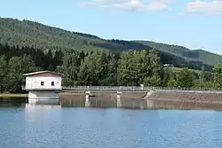 Zapora ziemna, wybudowana na fragmencie łuku o promieniu 220 m. Rdzeń z przesortowanego materiału gliniastego, który jednocześnie tworzy uszczelnienie wału. Od strony górnej wody zapora jest obmurowana kamieniem. Od strony powietrznej została obsypana materiałem ziemnym niesortowanym, podpartym obudową kamienną oraz obłożona darnią, a następnie dosiewana trawą. W budowie wykorzystano prawie wyłącznie miejscowe materiały: glina pochodziła z kilku wykopów na terenie przyszłego zbiornika, kamień wydobywano w lokalnych kamieniołomach, a lepszej jakości sprowadzano z doliny na stokach nieodległej Kněhyni[3].