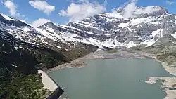 Zapora wodna betonowa typu ciężkiego. Mur zapory, dwukrotnie załamany, ma długość w koronie 616 m, maksymalną wysokość 52 m i objętość betonu 230 000 m³. Korona zapory znajduje się na wysokości 1925 m n.p.m.[2]