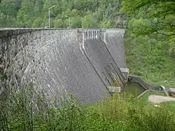 Zbudowana w roku 1917, zapora kamienna, długość w koronie wynosi 230 m, szerokości u podstawy 29 m, wysokość 44 m.